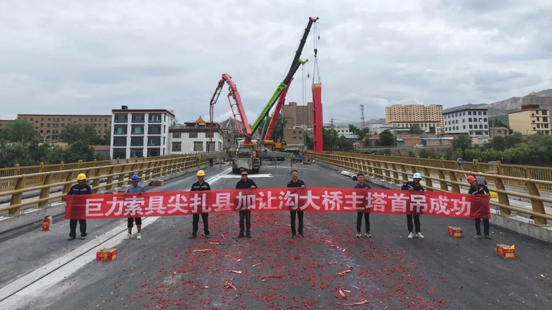 6月20日,加讓溝大橋主塔首吊作業(yè)取得圓滿成功,巨力索具股份有限公司承建了該項(xiàng)目的所有上部懸索結(jié)構(gòu),包括基座及主塔鋼結(jié)構(gòu),索鞍和索夾鋼結(jié)構(gòu),懸索橋主纜,吊桿用鋼拉桿及錨固鋼拉桿。