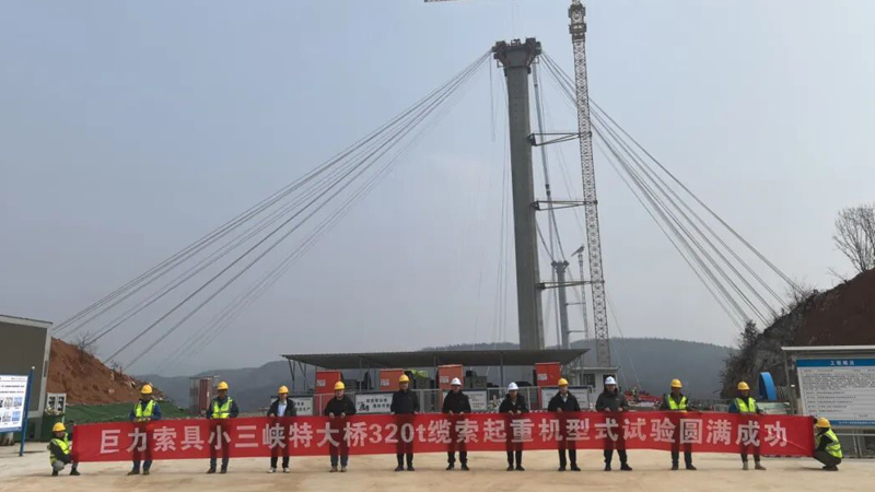 由巨力索具研發(fā)的丹江小三峽特大橋纜索起重機(jī)系統(tǒng)順利完成安裝調(diào)試,成功完成首節(jié)鋼箱梁吊裝,標(biāo)志著這一國(guó)家重點(diǎn)橋梁工程邁入主體施工的關(guān)鍵階段。