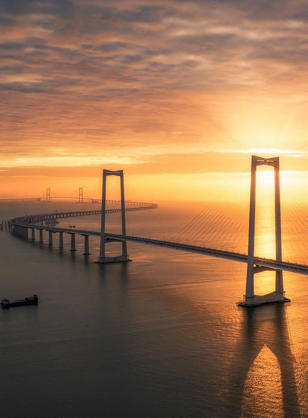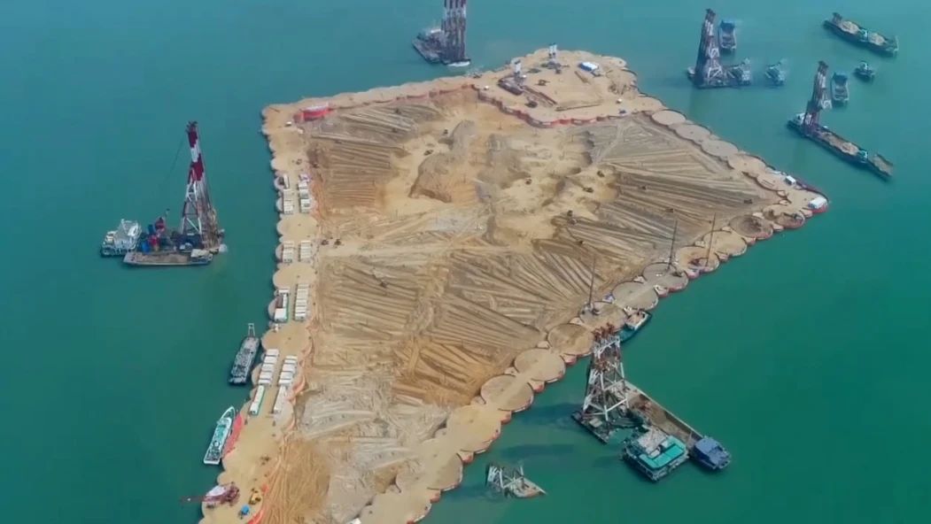 2017年9月18日,隨著最后一根鋼圓筒振沉到位,57個鋼圓筒,每個直徑28米、高35-40米,重達650噸全部精準牢固地打入海底巖層中。西人工島外圈圍堰如珠玉般勾勒出“海上鯤鵬”。僅用4個半月,在寬闊的伶仃洋中間,憑空筑起一座相當于19個足球場大小的人工島,刷新了快速成島的世界紀錄。