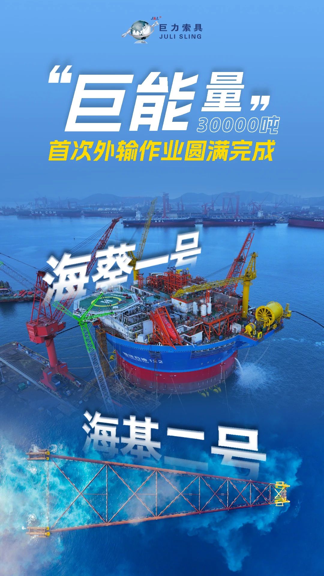 同時(shí),巨力索具承擔(dān)了“?;?hào)”的吊裝工作。2024年3月,“海基二號(hào)”作為亞洲第一深水導(dǎo)管架,是亞洲高度最高、重量最大的導(dǎo)管架。巨力索具通過環(huán)形無接頭繩圈等高性能產(chǎn)品,確保了導(dǎo)管架在深海中的穩(wěn)定和安全,創(chuàng)造了固定式海洋平臺(tái)重量、高度、作業(yè)深度等多項(xiàng)亞洲紀(jì)錄。