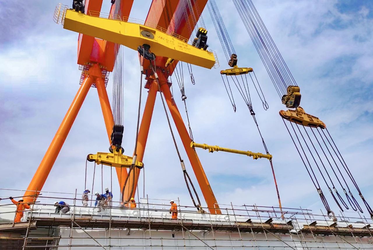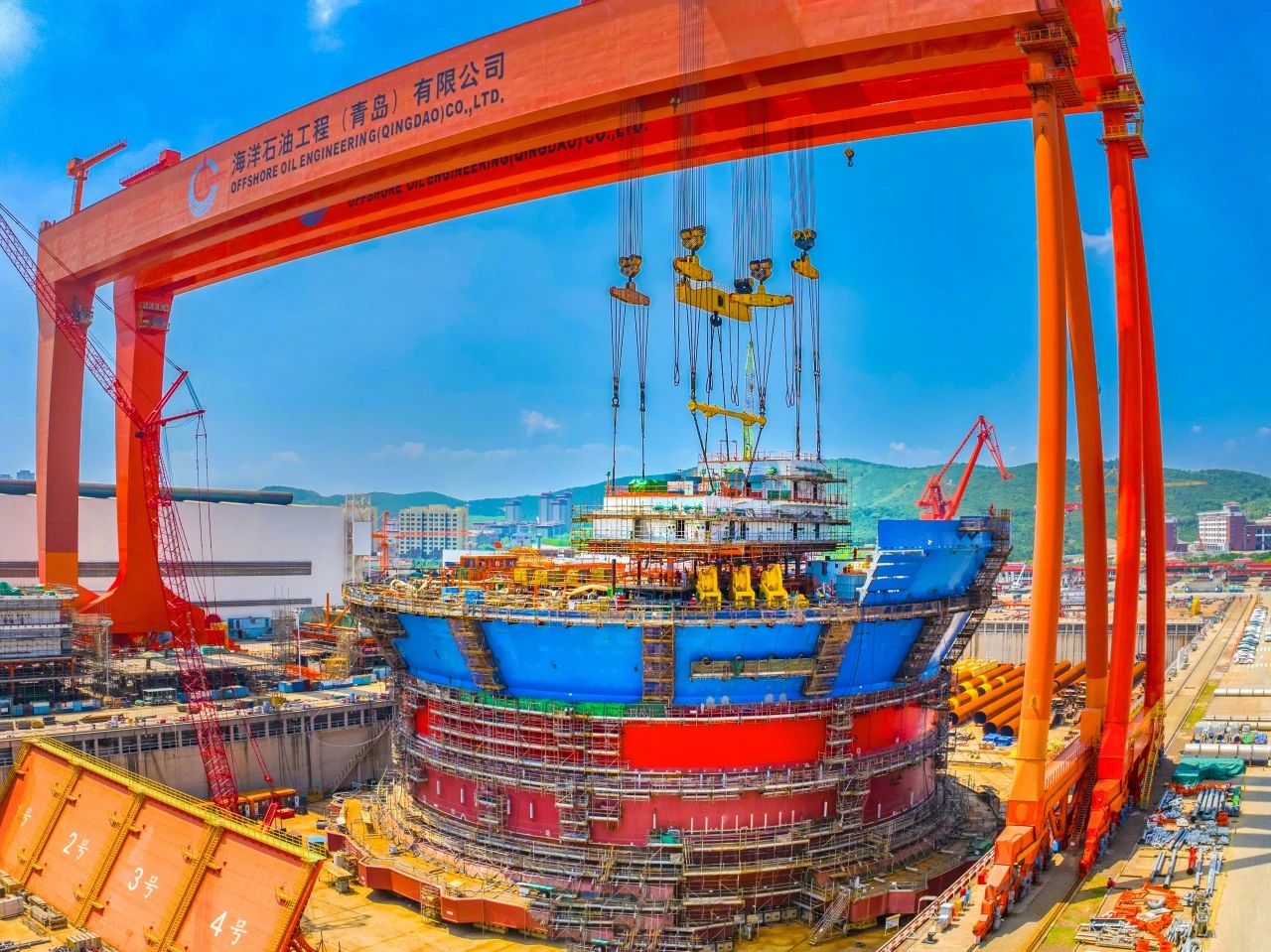 2023年12月,由我國自主設(shè)計(jì)建造的亞洲首艘圓筒型“海上油氣加工廠”“海洋石油122”浮式生產(chǎn)儲(chǔ)卸油裝置——“??惶?hào)”超級(jí)能源碗在青島完成主體建造,巨力索具提供800噸吊梁、400噸、500噸吊排及配套索具組成成套吊裝系統(tǒng),全程配合吊裝順利進(jìn)行。