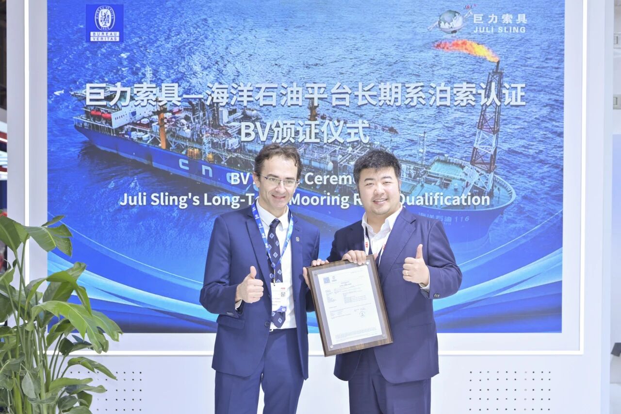在2025中國(guó)國(guó)際海事會(huì)展期間,法國(guó)船級(jí)社(BV)向巨力索具頒發(fā)了“海洋石油平臺(tái)長(zhǎng)期系泊索”專項(xiàng)認(rèn)證證書。這項(xiàng)認(rèn)證是針對(duì)海洋石油平臺(tái)長(zhǎng)期系泊索這一技術(shù)門檻領(lǐng)域的專項(xiàng)認(rèn)證,是對(duì)巨力索具深耕深海裝備技術(shù)的最佳注腳。