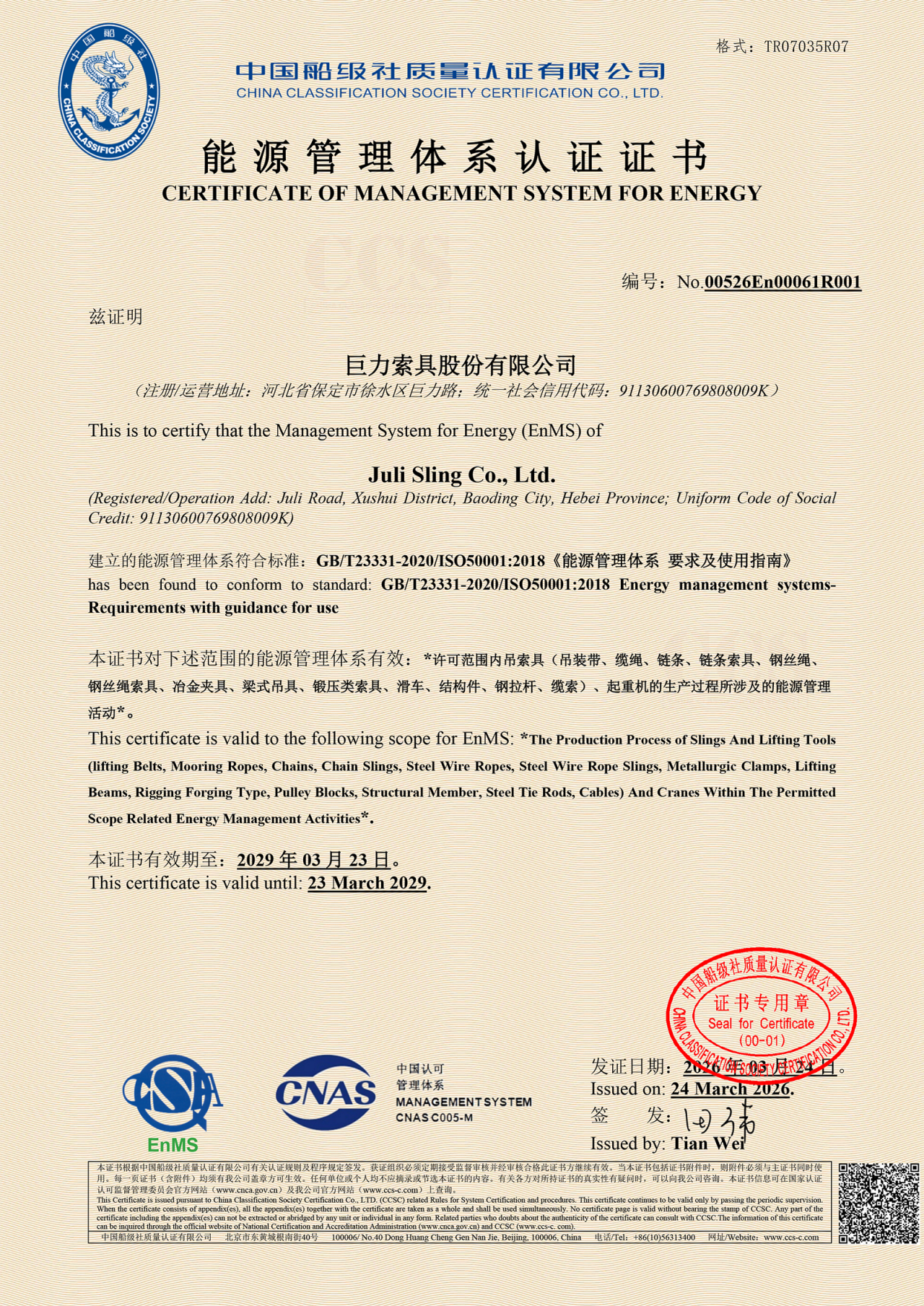 官宣 | 巨力索具斬獲中國(guó)船級(jí)社(CCS)能源管理體系認(rèn)證證書!