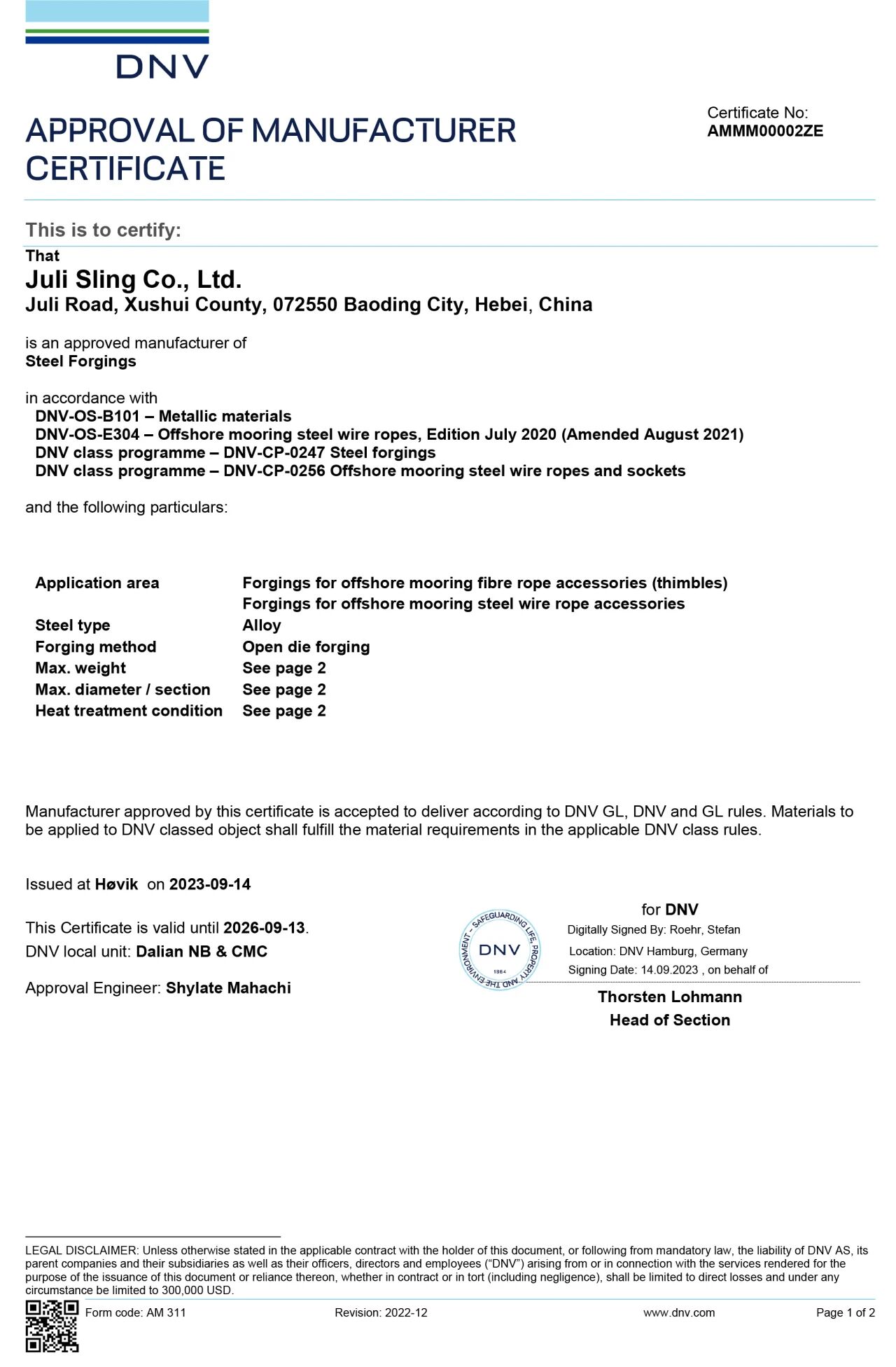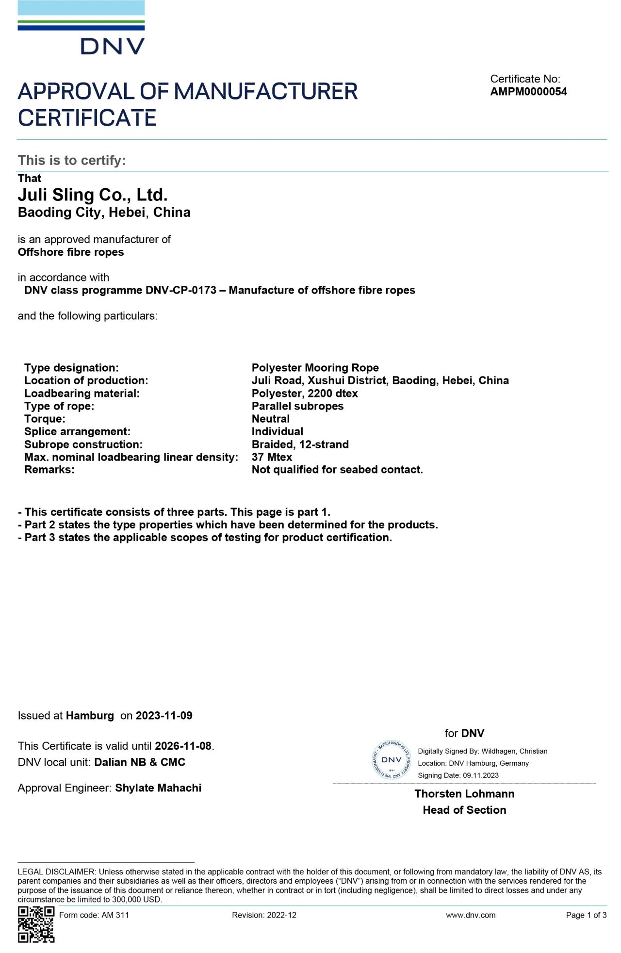 巨力索具先后取得挪威船級(jí)社(DNV)多項(xiàng)認(rèn)證,逐步構(gòu)建起較為完整的系泊產(chǎn)品認(rèn)證體系?!?DNV焊接工廠認(rèn)可證書△ 永久系泊用單股涂塑鋼絲繩的DNV·GL工廠認(rèn)可證書△ DNV長(zhǎng)期系泊鋼絲繩接頭及纜繩套環(huán)鍛件工廠認(rèn)可證書
