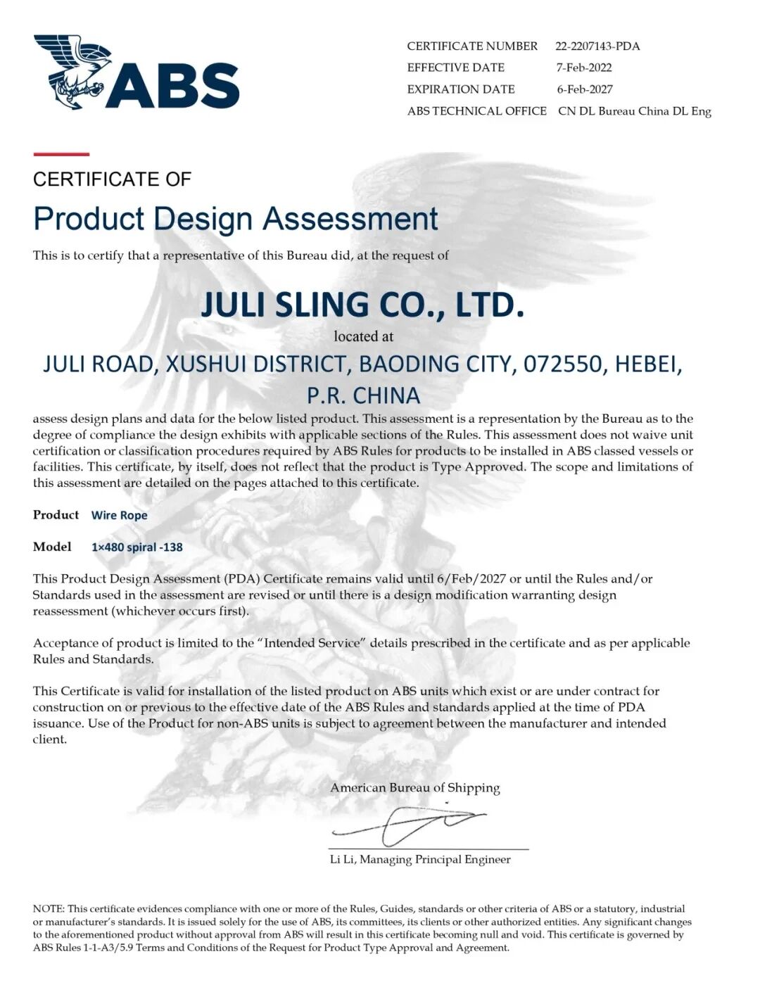 △ 美國(guó)船級(jí)社(ABS)單股鋼絲繩ABS設(shè)計(jì)評(píng)估證書
